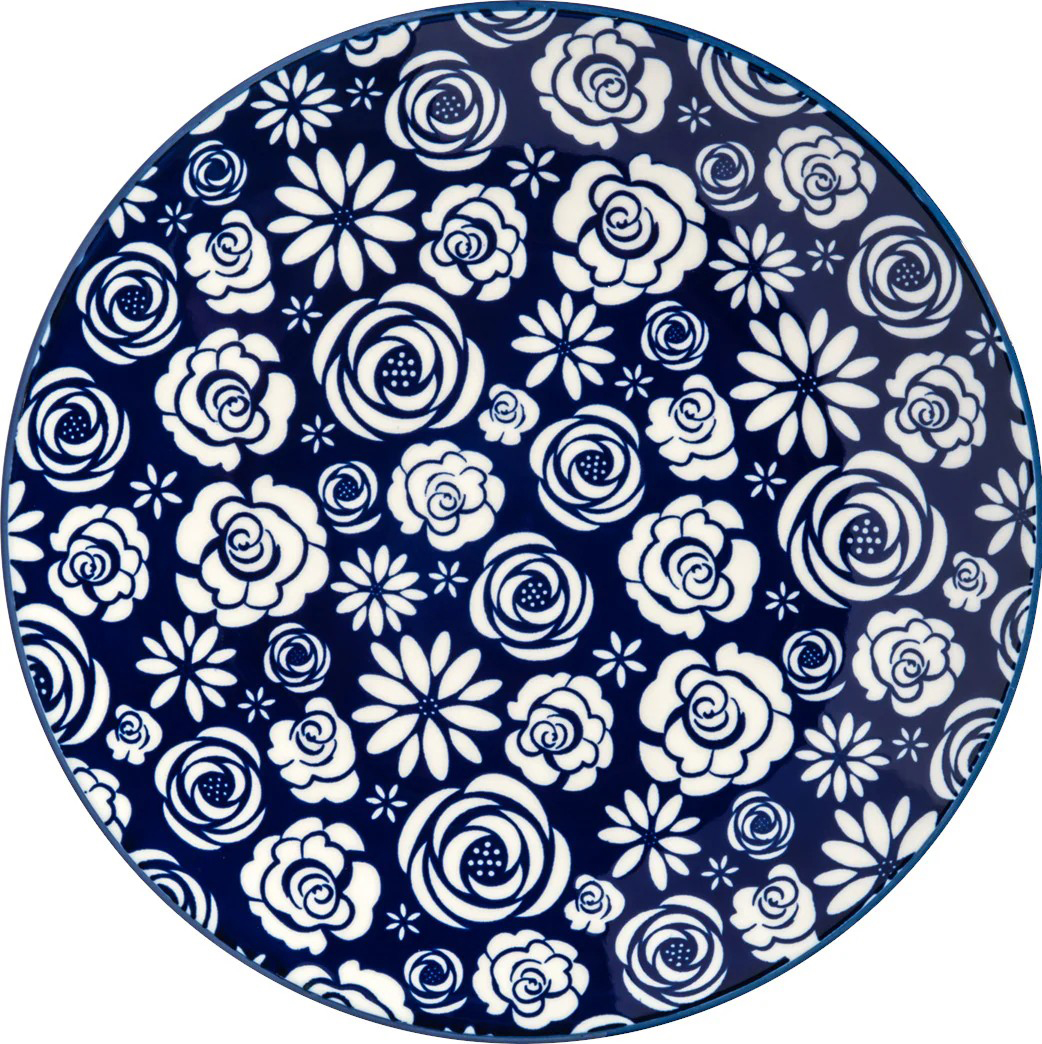 Bring some playful, retro flair to your kitchen! This Blue Retro Rose Dinner Plate features a cheerful, densely packed pattern of stylized roses and star-shaped flowers in deep cobalt blue. The high-contrast, graphic print has a wonderfully nostalgic feel that brightens any table. Durable, delightful, and designed to stand out.